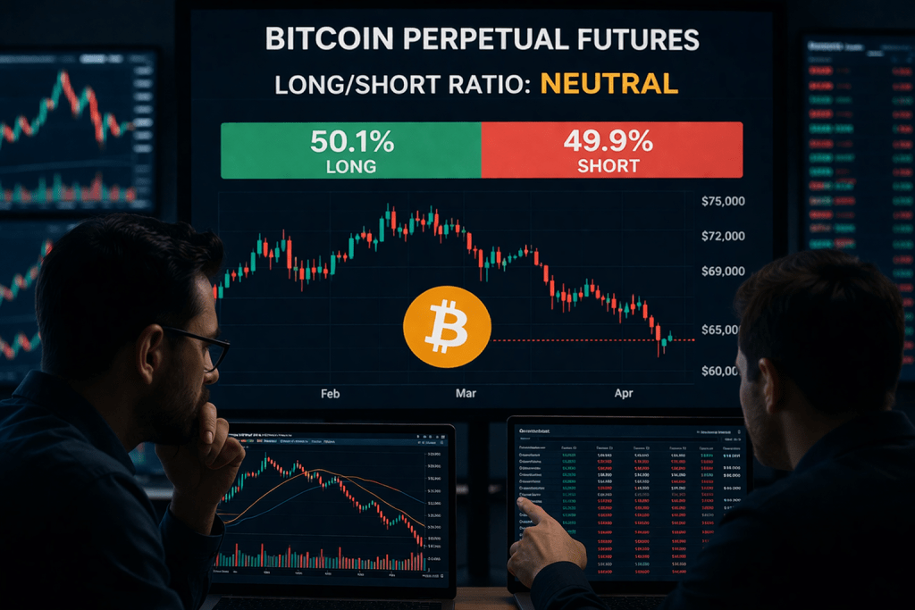 Looking at the derivatives market, the BTC perpetual futures long/short ratio currently sits near an even split, with bulls and bears almost perfectly balanced.
